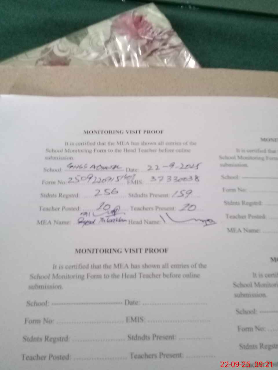 | Attendance Register | Head Teacher | MEA with School | Visit Proof |