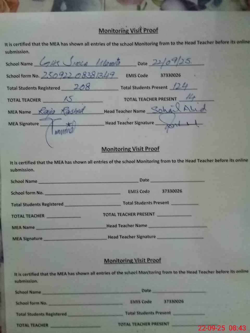 | Monitoring Date: 22-09-2025 | Start Time: 22-09-2025 08:09 AM | End Time: 22-09-2025 08:43 AM | Name of MEA: Ra**** Ra**** Al**** | |