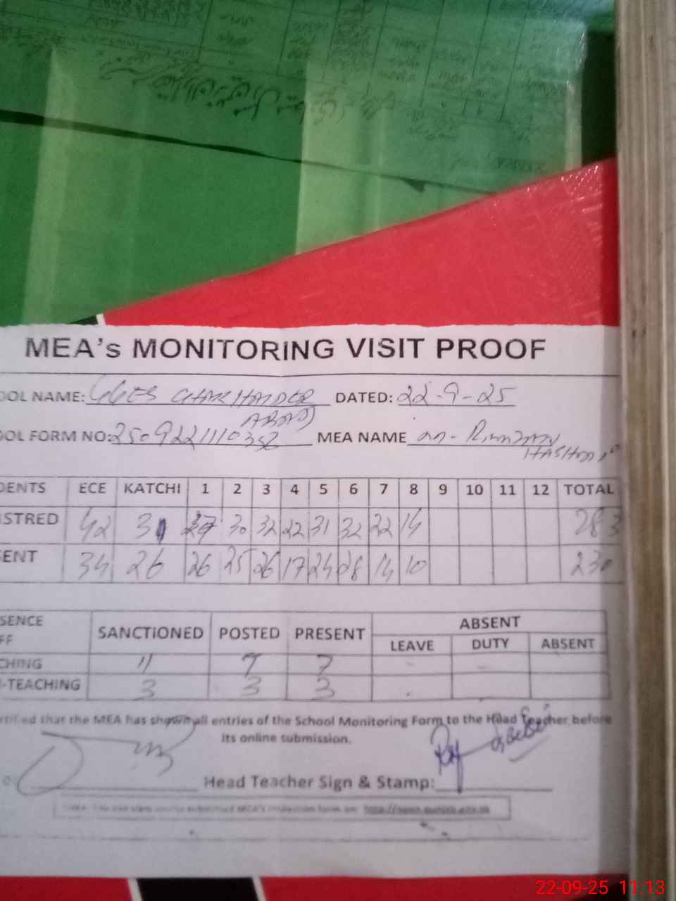 | Attendance Register | Head Teacher | MEA with School | Visit Proof |