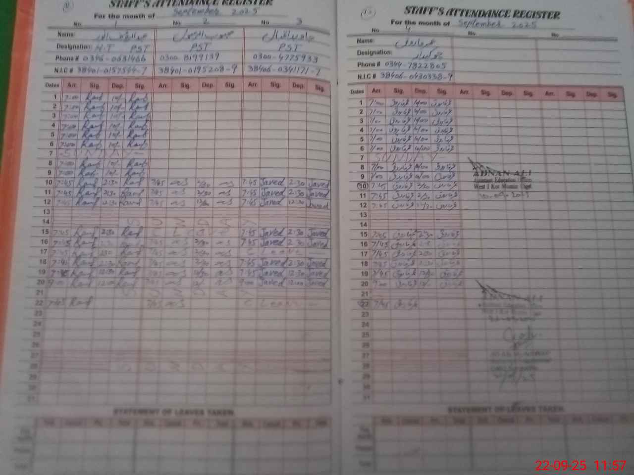 | CNIC | Full Name | Designation | R/C | Absence during last cal. month |