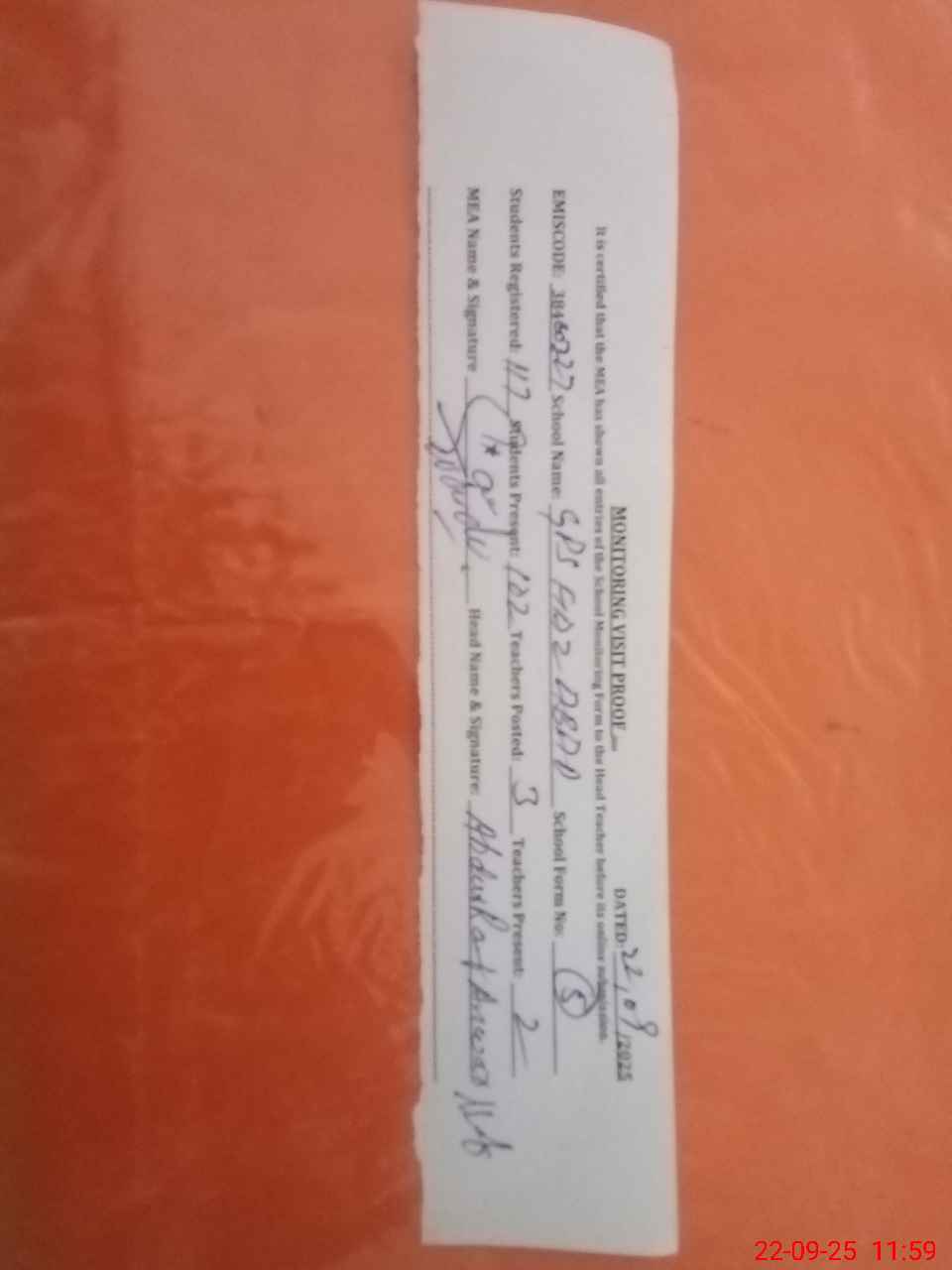 | Attendance Register | Head Teacher | MEA with School | Visit Proof |
