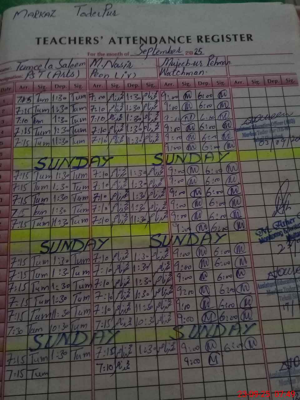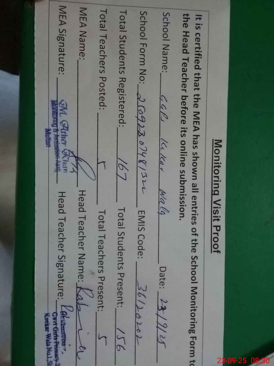 | Attendance Register | Head Teacher | MEA with School | Visit Proof |