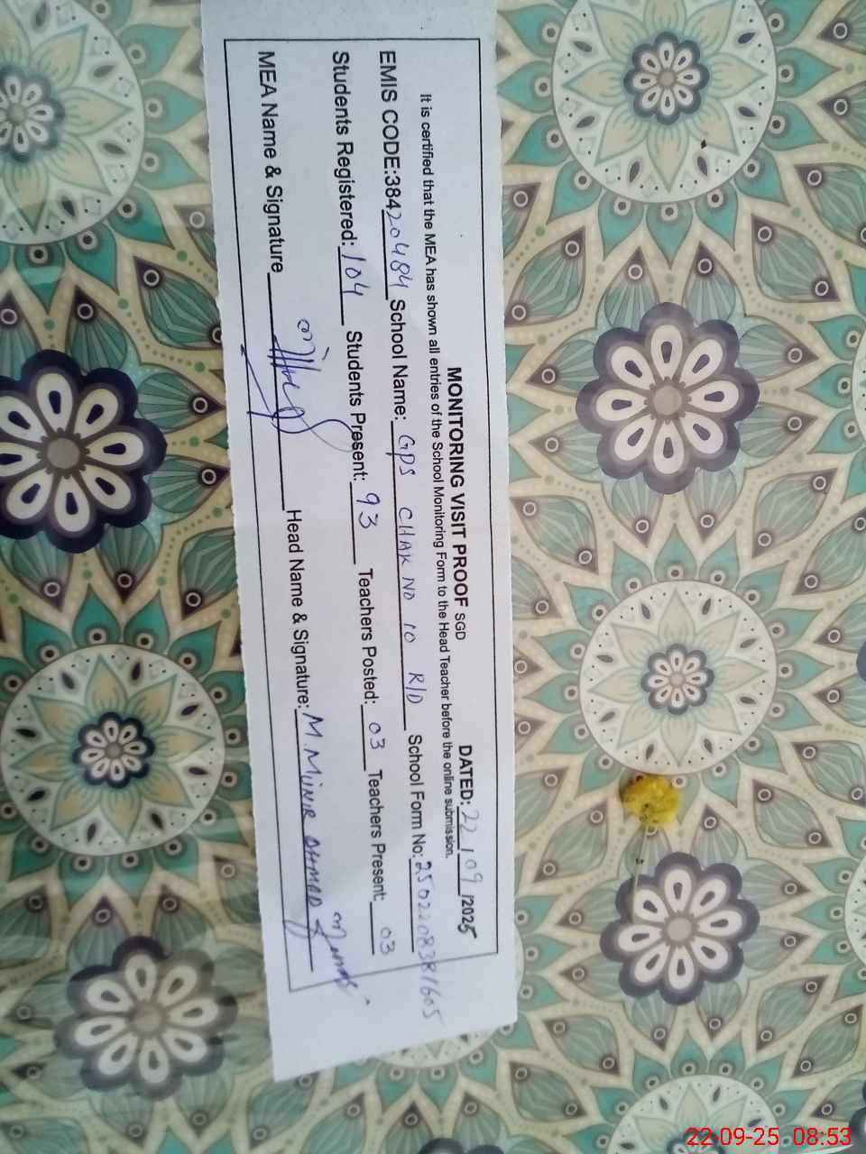 | Attendance Register | Head Teacher | MEA with School | Visit Proof |