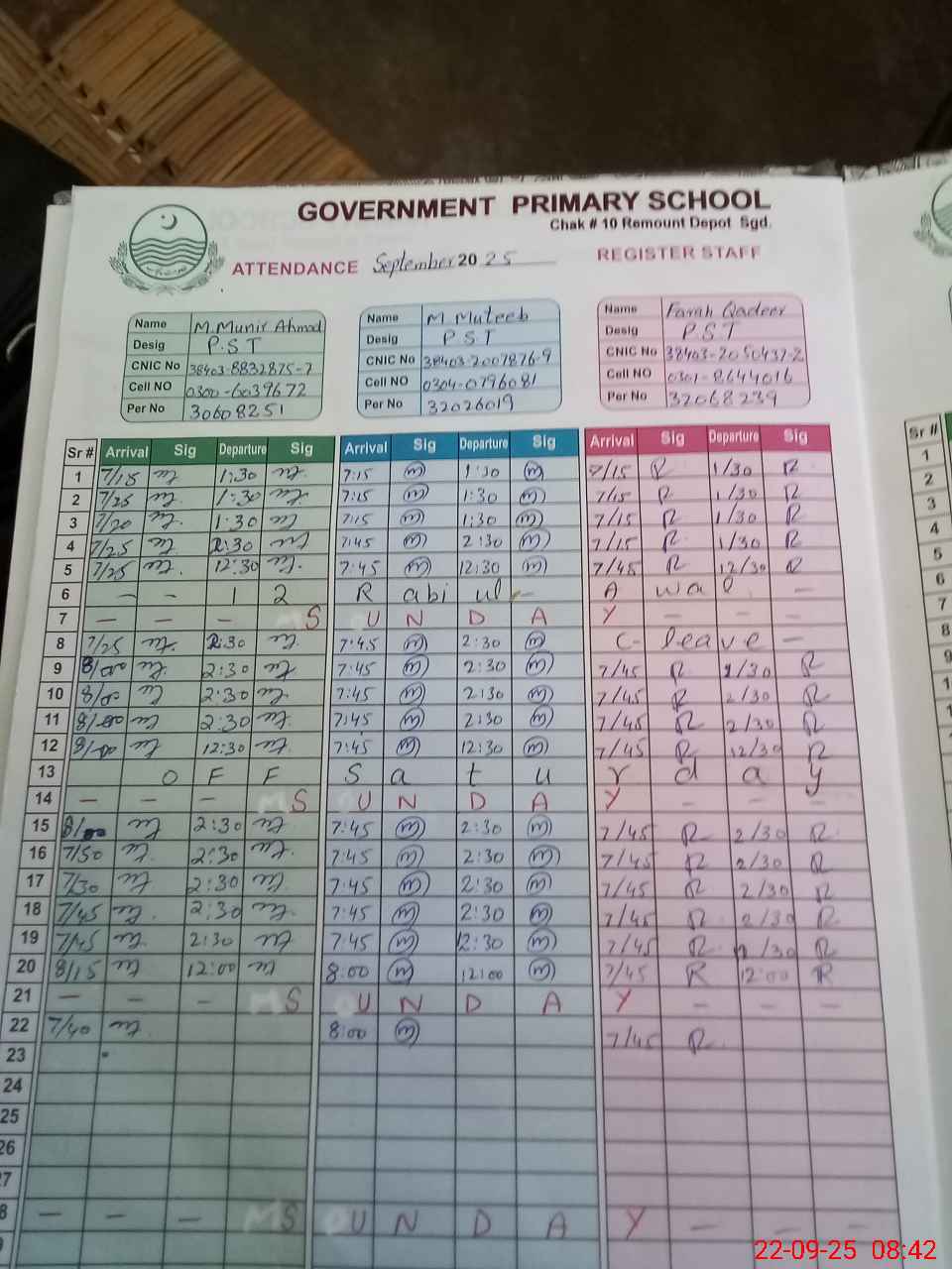 | CNIC | Full Name | Designation | R/C | Absence during last cal. month |