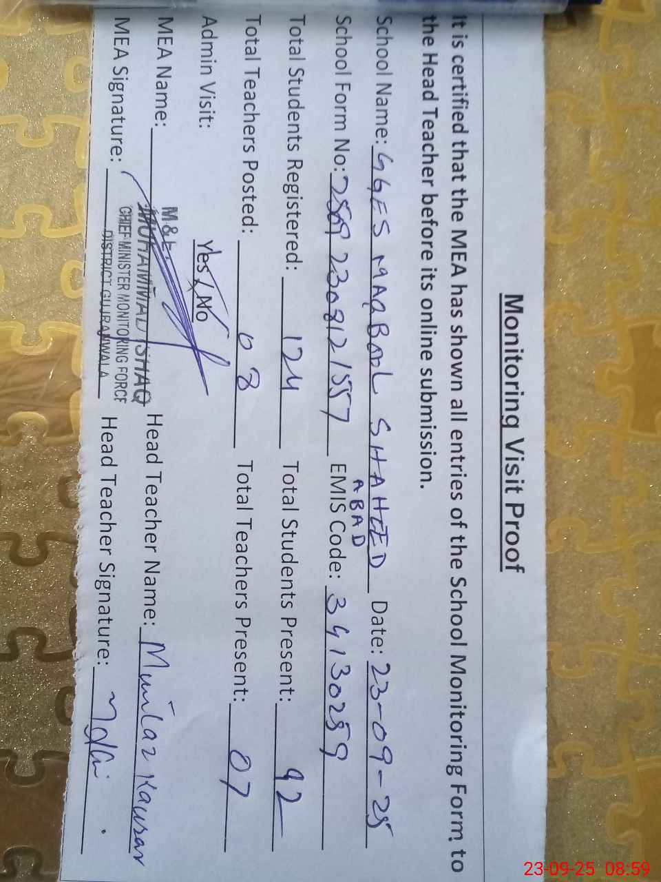 | Attendance Register | Head Teacher | MEA with School | Visit Proof |