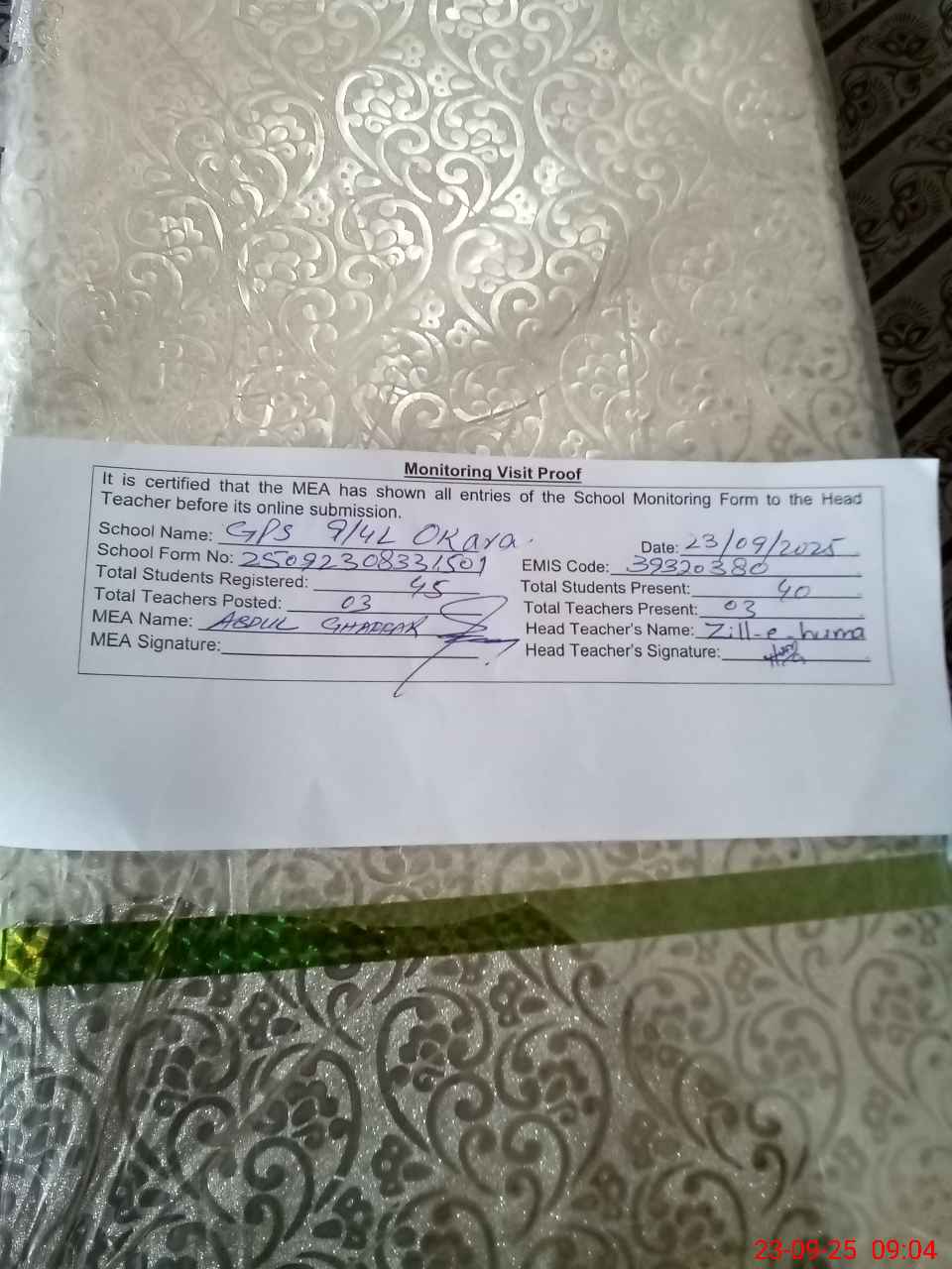 | EMIS Code: 39320380 | Name of School: GPS CHAK NO 9/4-L | |||