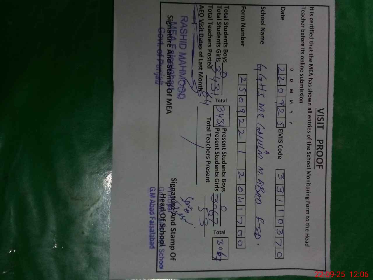 | Certified that this School was Inspected by the Undersigned MEA/DMO Today and the Information Stated Above is as Per Record. | |||||