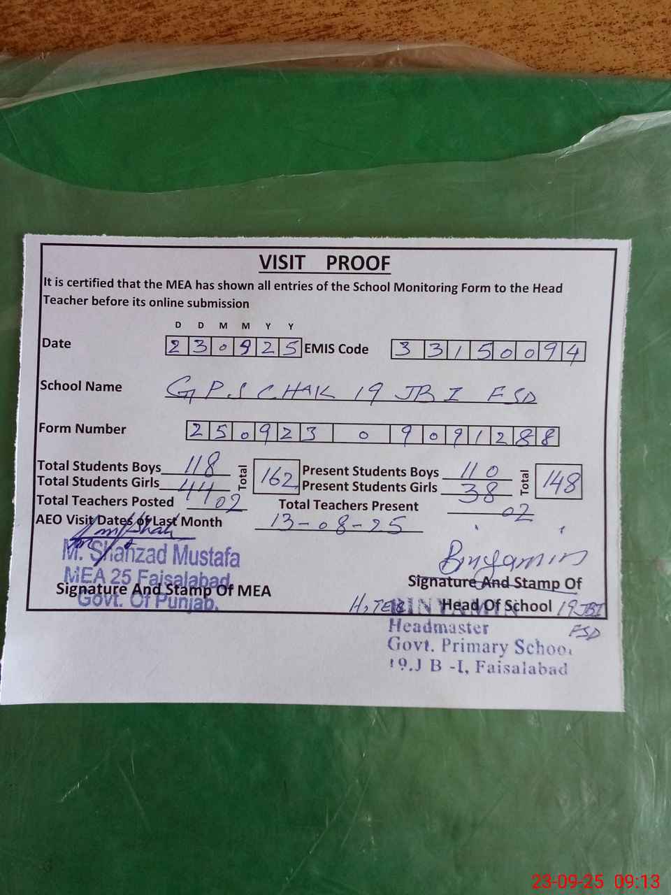 | Attendance Register | Head Teacher | MEA with School | Visit Proof |