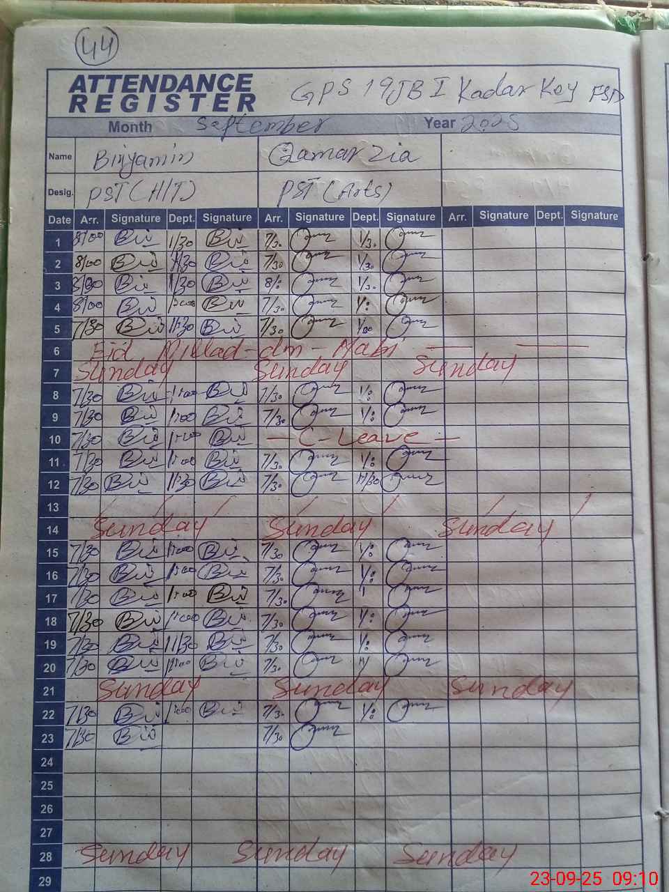 | Monitoring Date: 23-09-2025 | Start Time: 23-09-2025 08:49 AM | End Time: 23-09-2025 09:18 AM | Name of MEA: MU**** SH**** MU**** | |
