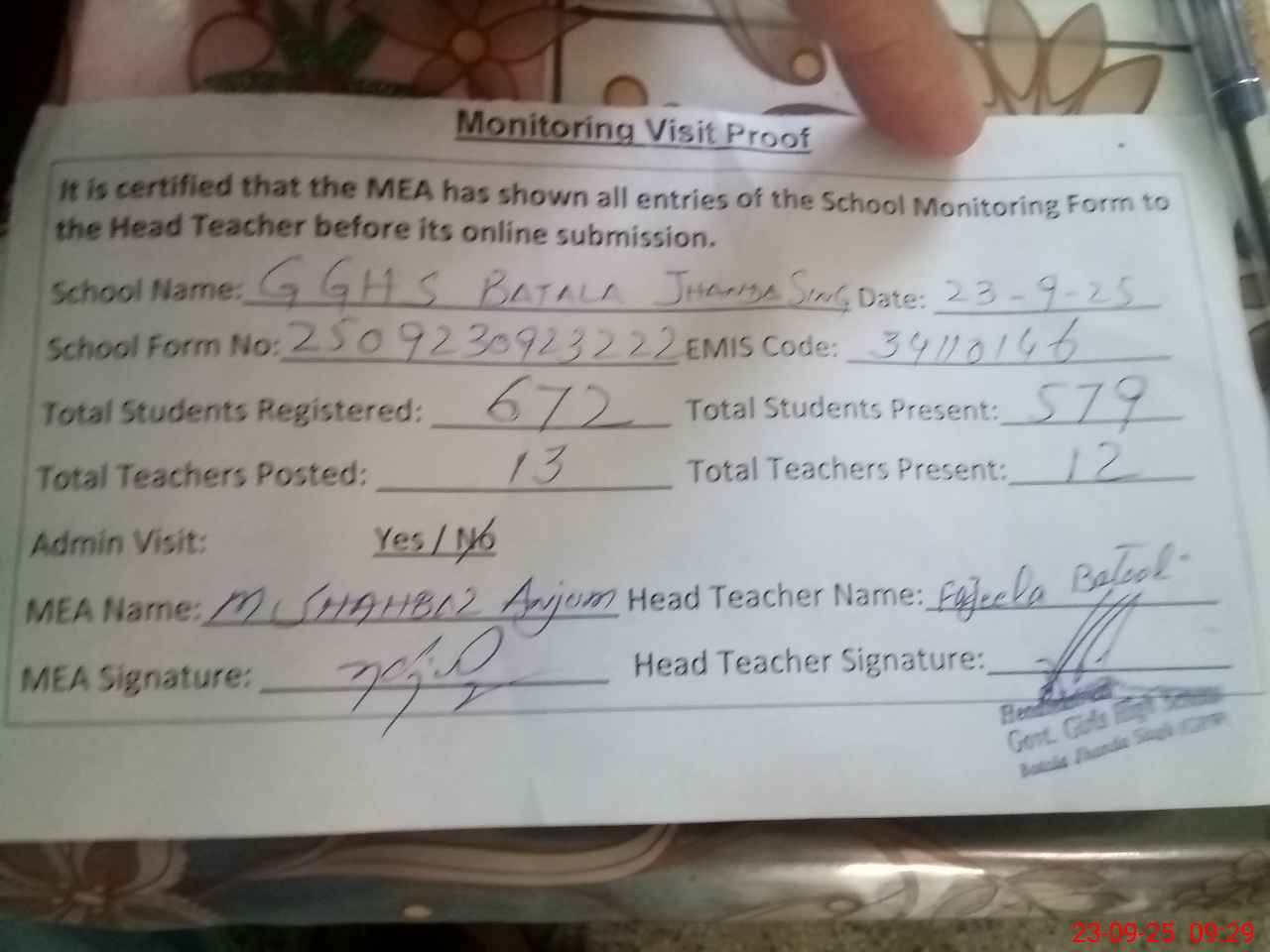 | Certified that this School was Inspected by the Undersigned MEA/DMO Today and the Information Stated Above is as Per Record. | |||||