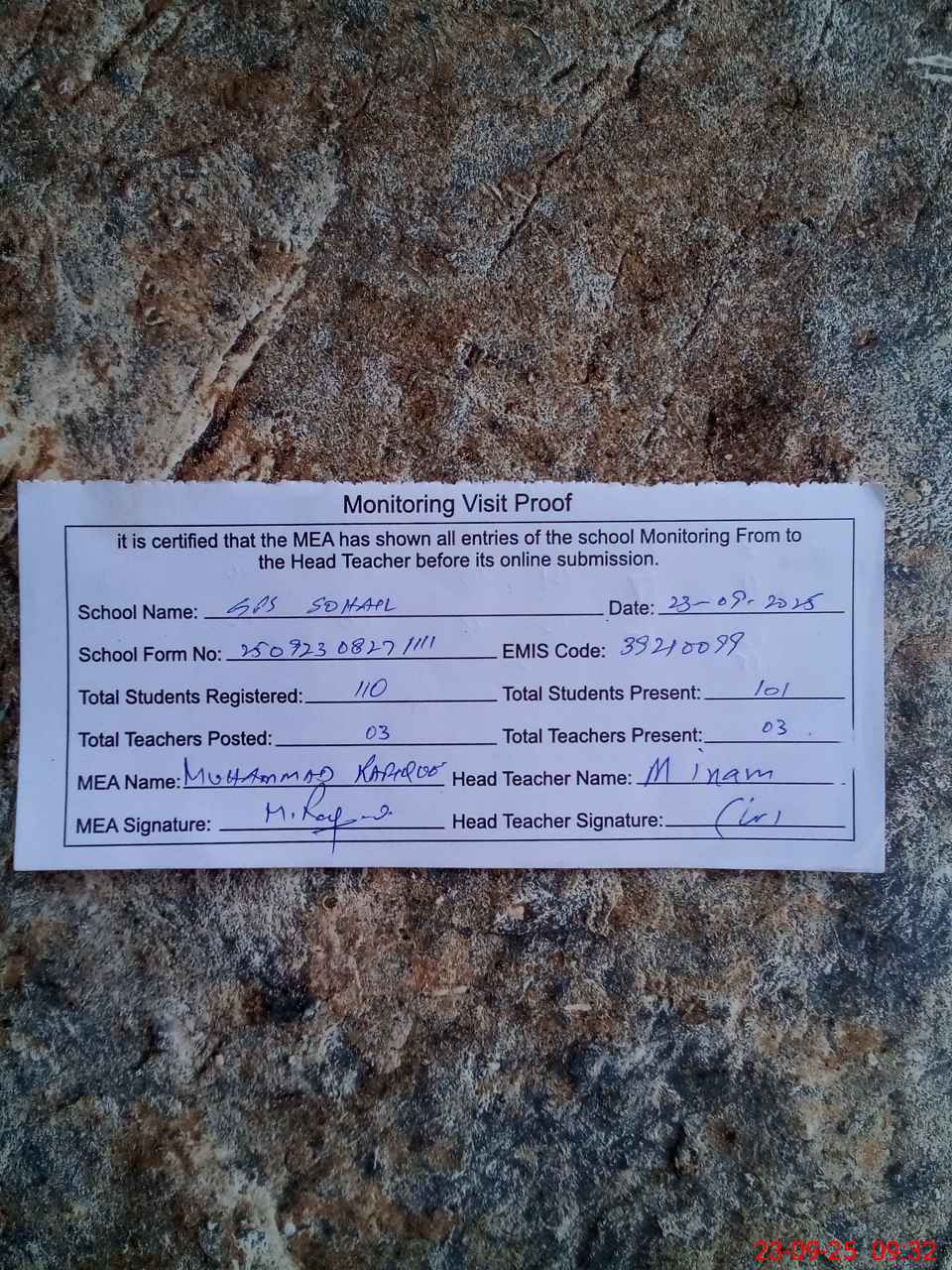 | Attendance Register | Head Teacher | MEA with School | Visit Proof |