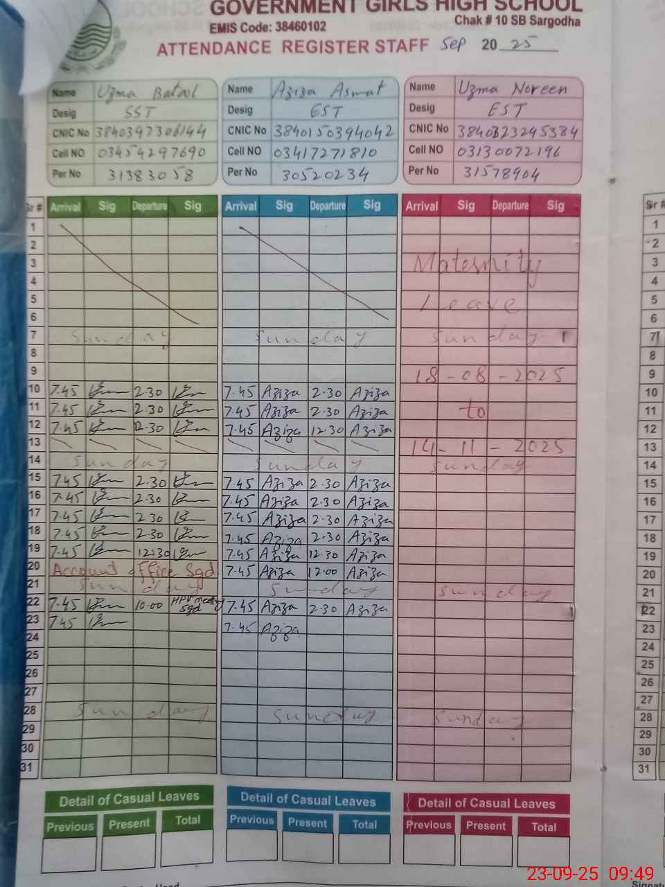 | Name: UZ**** BA**** Designation: (School Headmaster's/Headmistress's) SST (ARTS) Phone/Cell Number: 03**** |