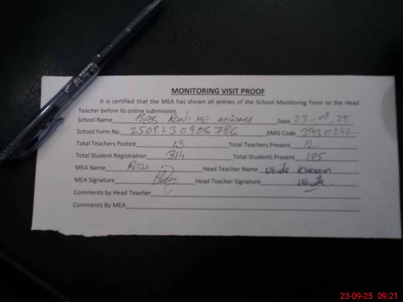 | Attendance Register | Head Teacher | MEA with School | Visit Proof |