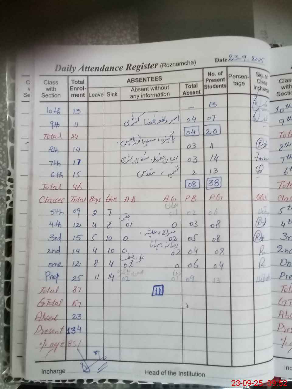 | No. of Students Present - Male | 0 | 0 | 9 | 6 | 4 | 5 | 3 | 2 | 13 | 14 | 11 | 7 | 13 | 87 | ||