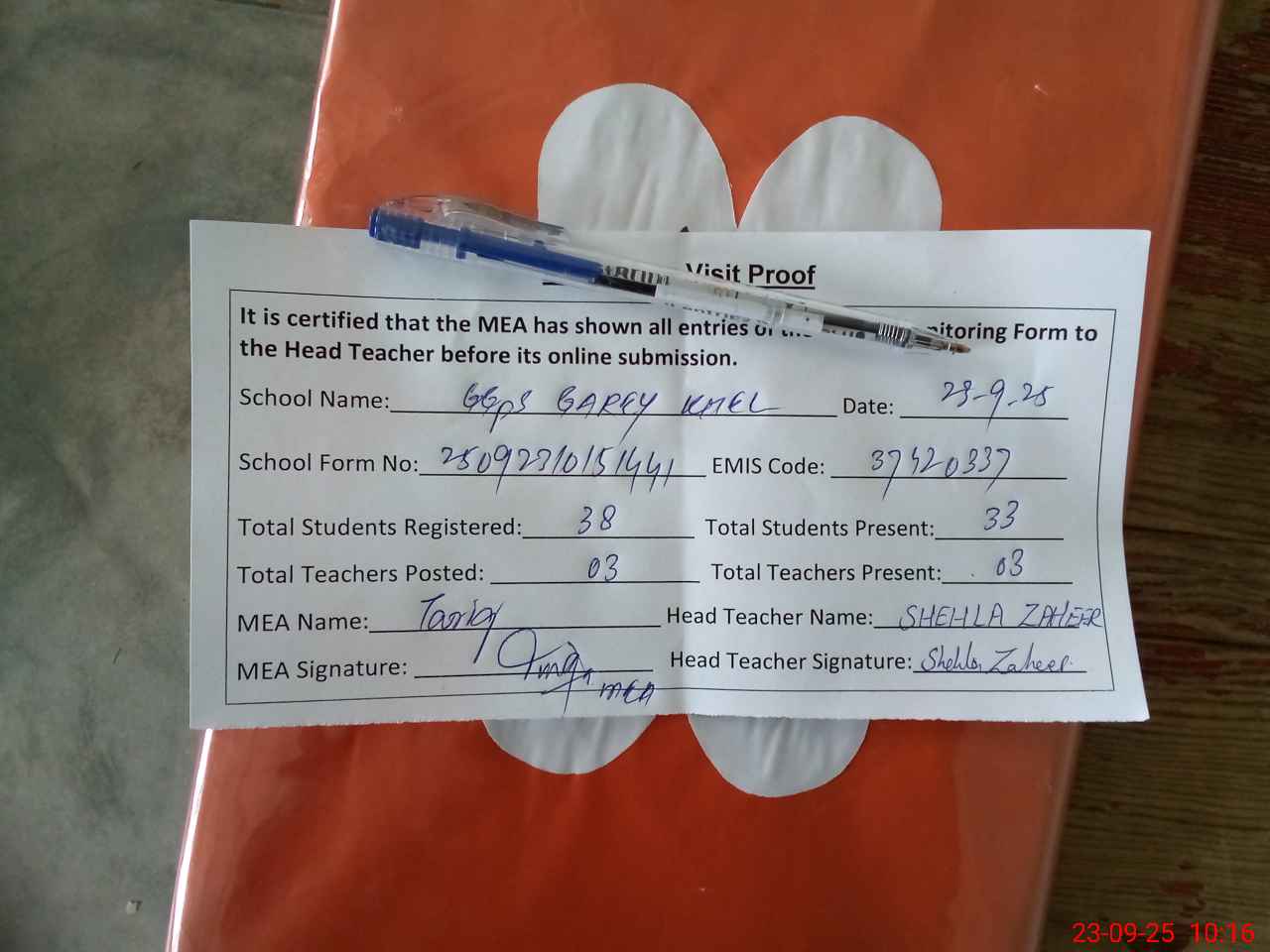 | Attendance Register | Head Teacher | MEA with School | Visit Proof |
