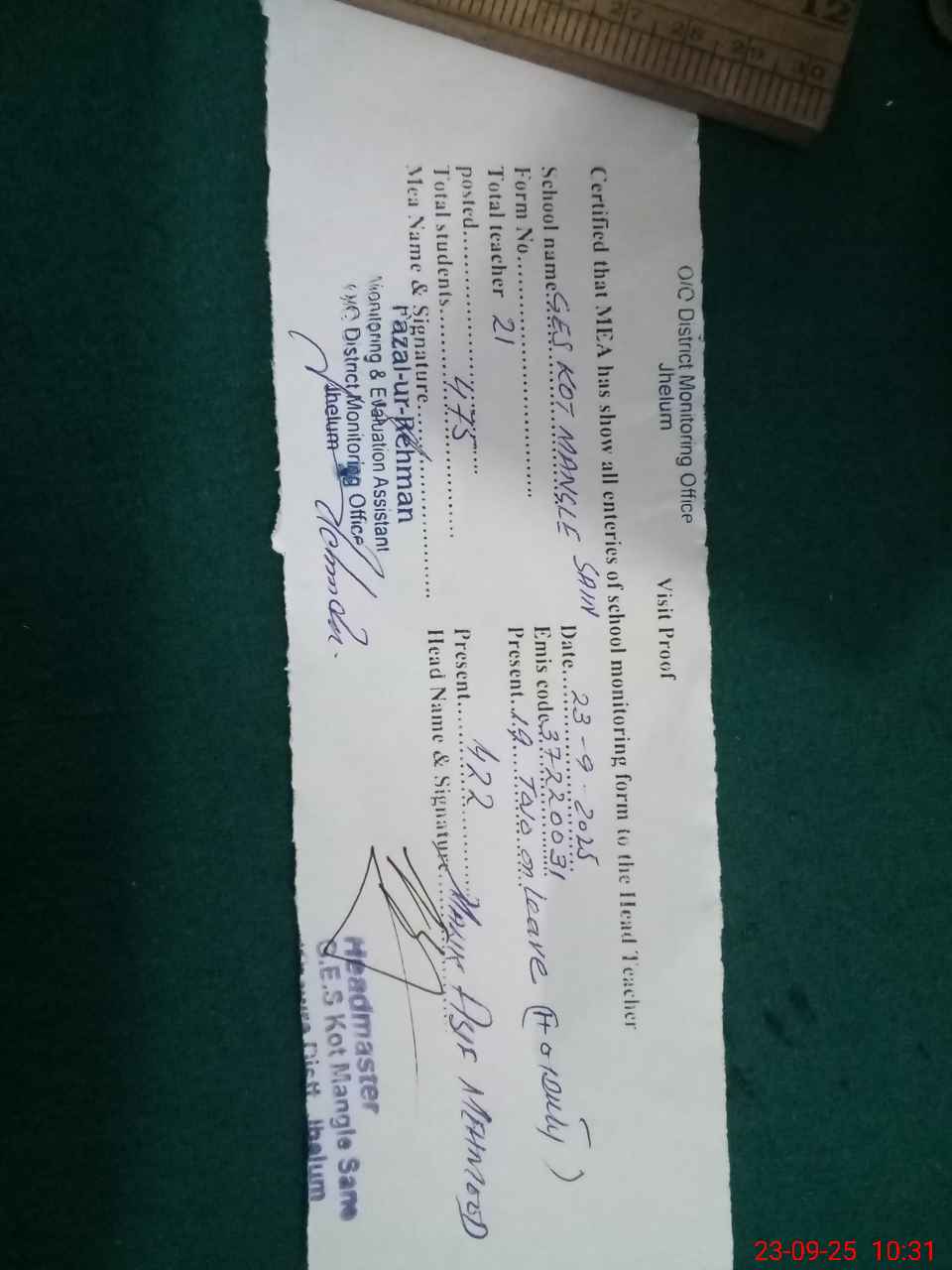 | Name: AS**** ME**** Designation: (School Headmaster's/Headmistress's) Headmaster Phone/Cell Number: 03**** |