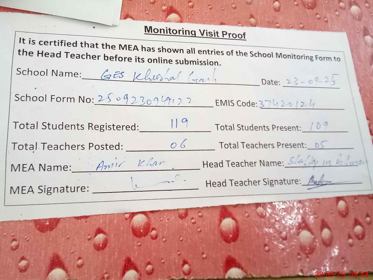 | Monitoring Date: 23-09-2025 | Start Time: 23-09-2025 09:06 AM | End Time: 23-09-2025 09:55 AM | Name of MEA: Am**** Kh**** | |