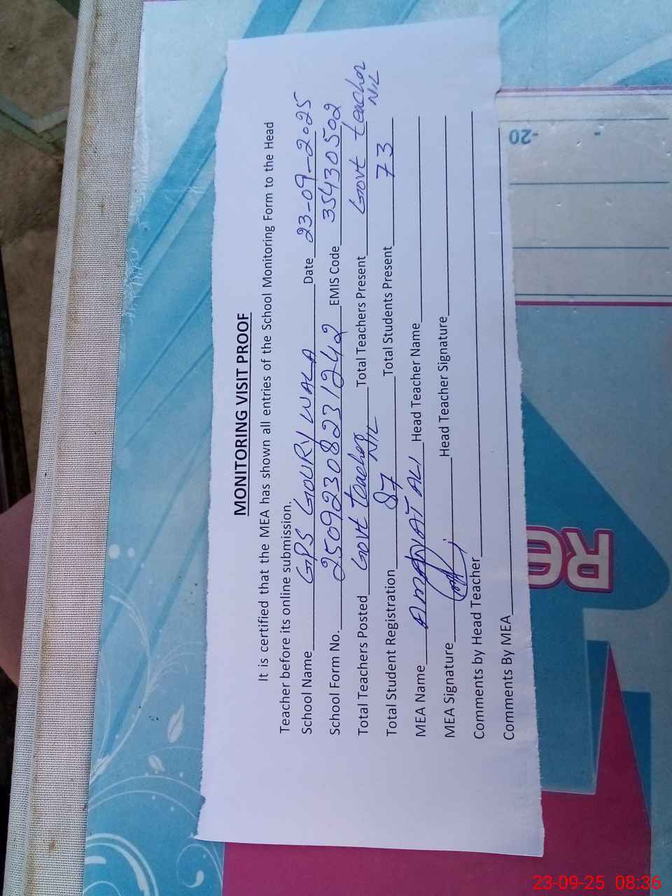 | Attendance Register | Head Teacher | MEA with School | Visit Proof |