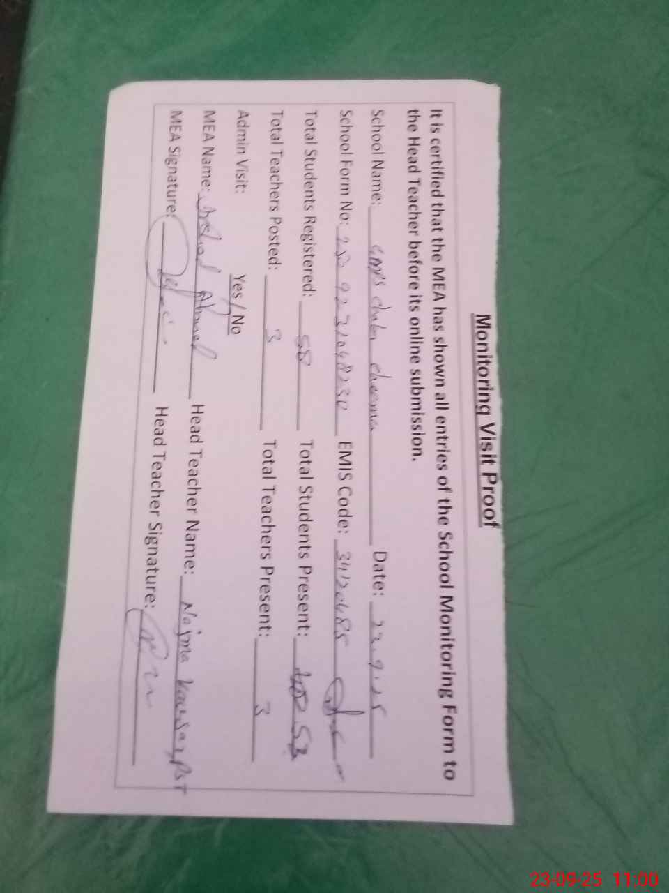 | Attendance Register | Head Teacher | MEA with School | Visit Proof |