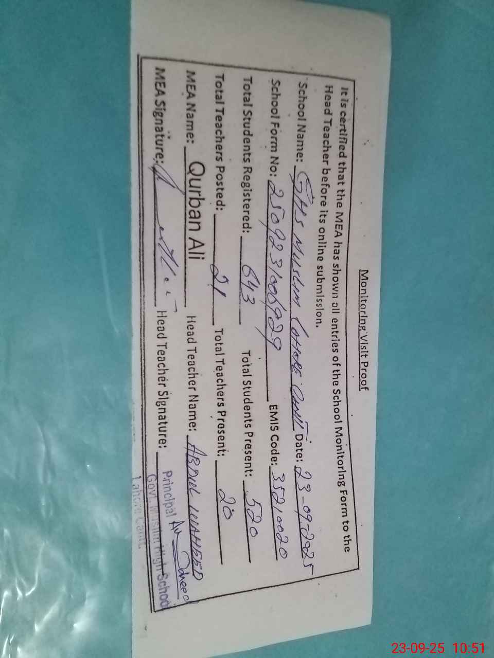| Attendance Register | Head Teacher | MEA with School | Visit Proof |