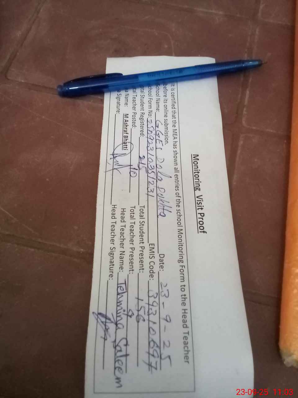 | Attendance Register | Head Teacher | MEA with School | Visit Proof |
