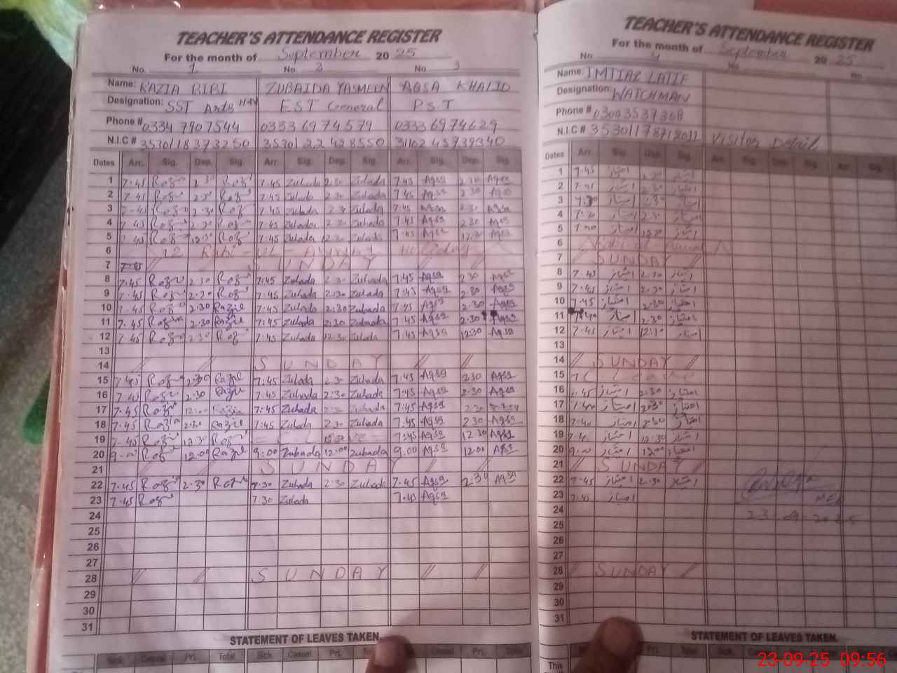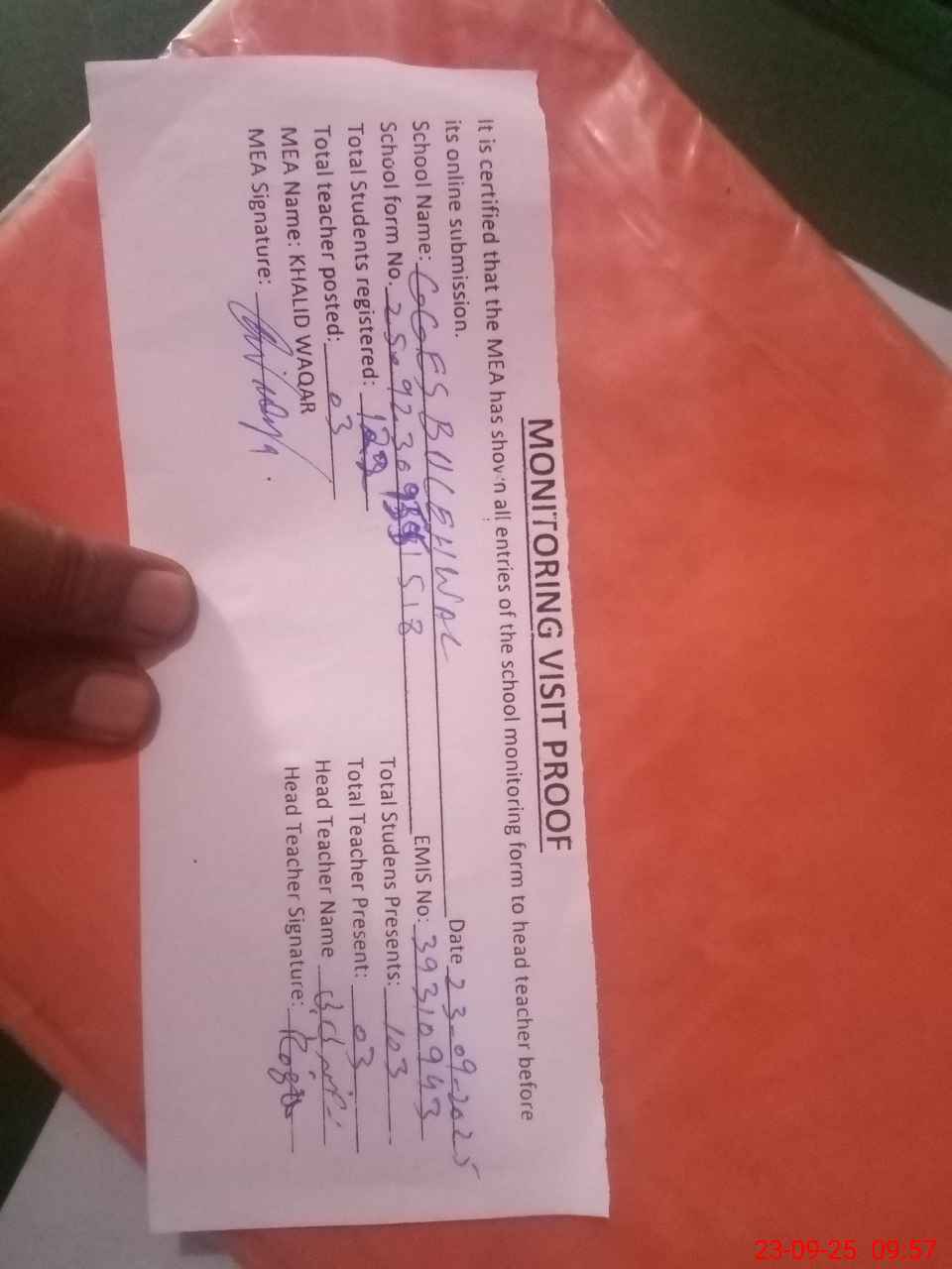 | Attendance Register | Head Teacher | MEA with School | Visit Proof |