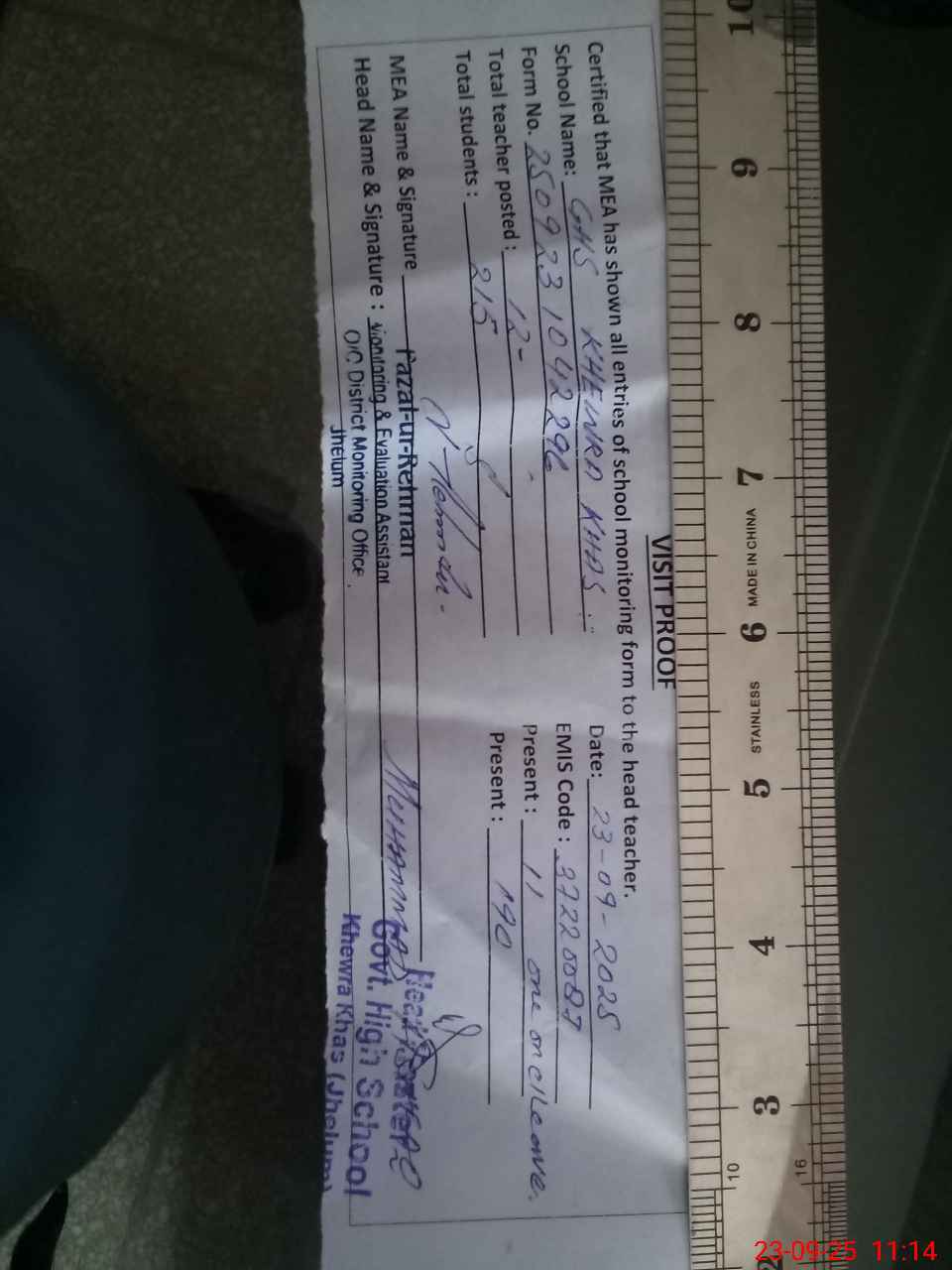 | Attendance Register | Head Teacher | MEA with School | Visit Proof |