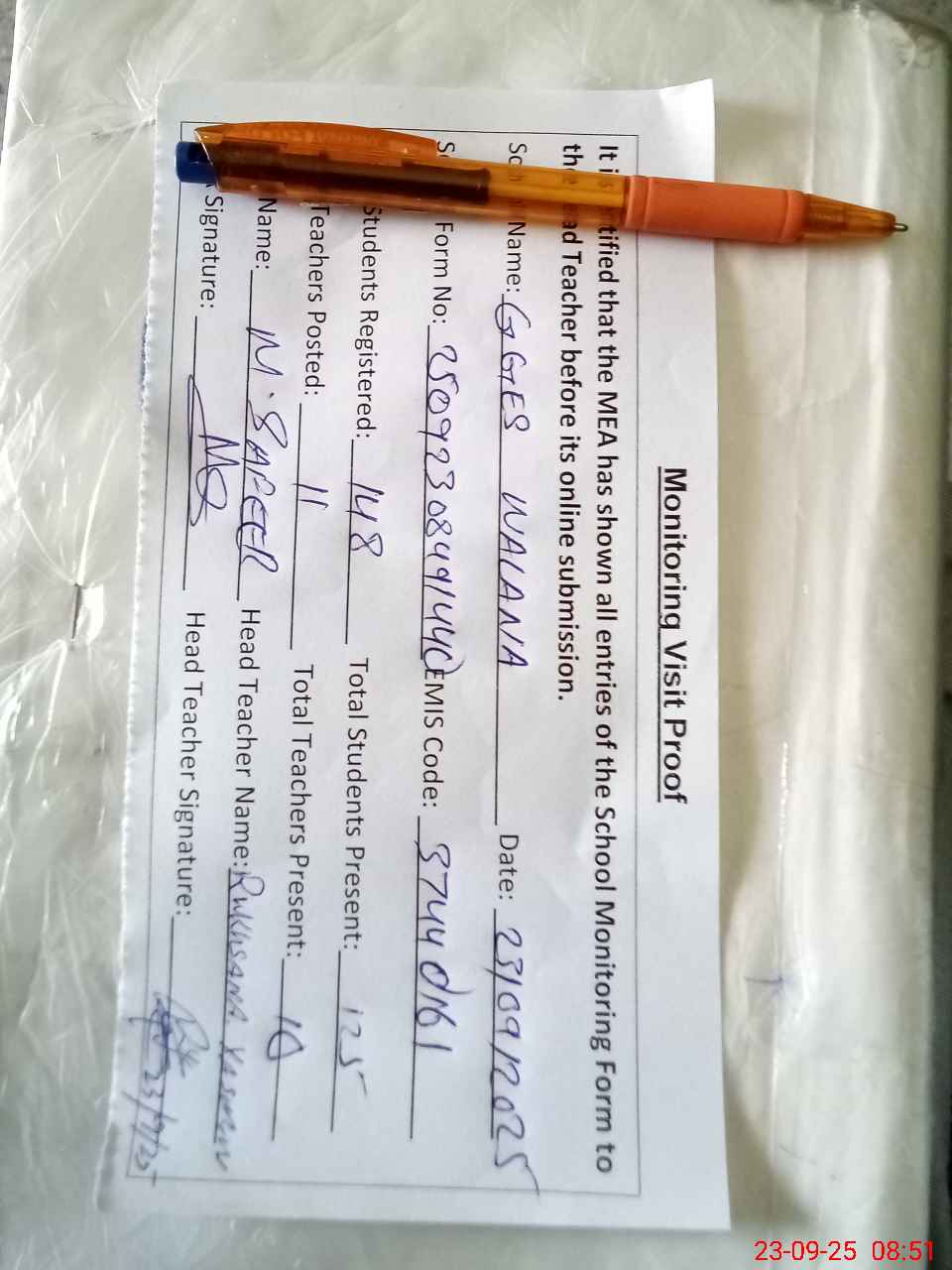 | Attendance Register | Head Teacher | MEA with School | Visit Proof |