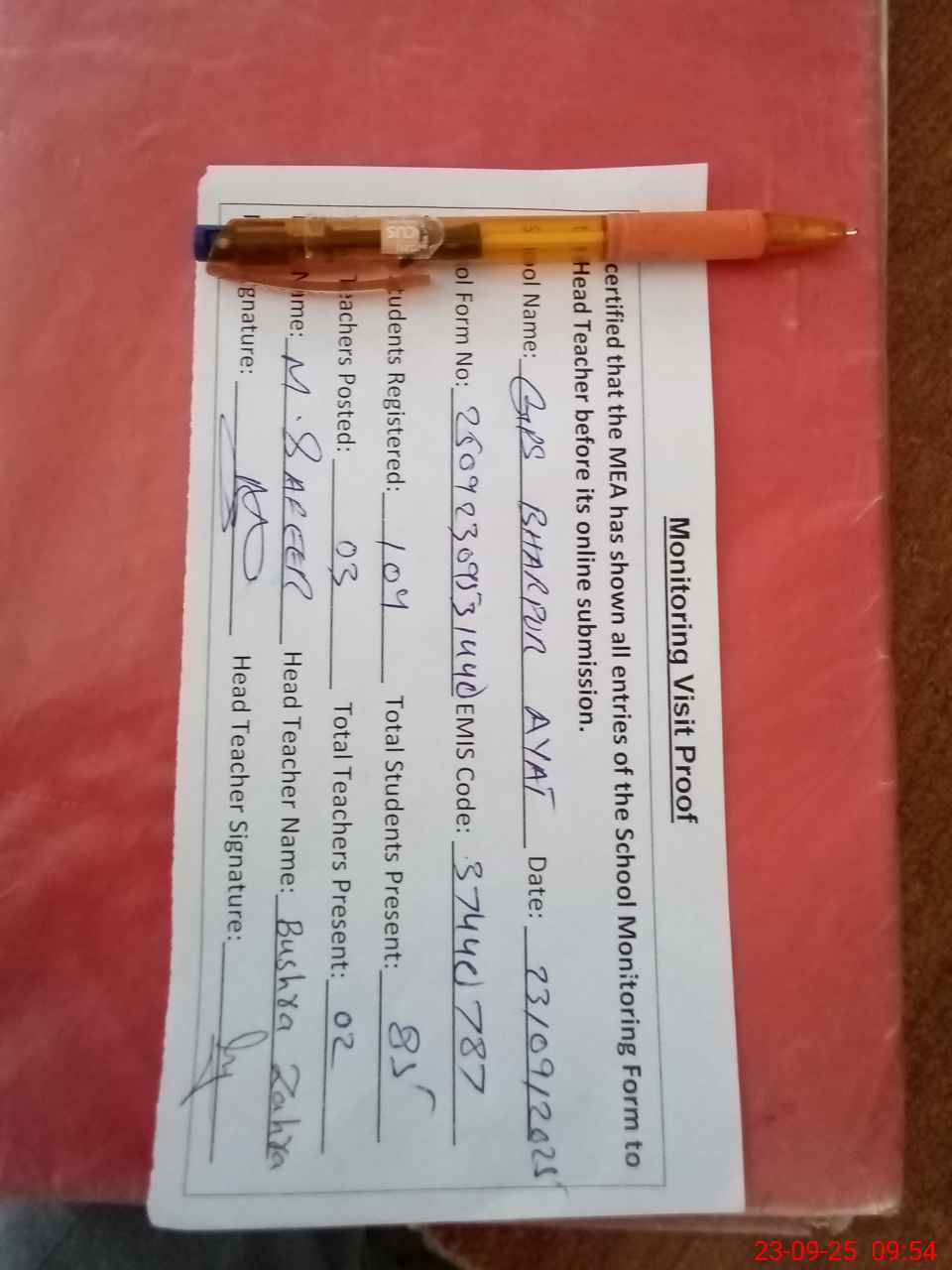 | Attendance Register | Head Teacher | MEA with School | Visit Proof |