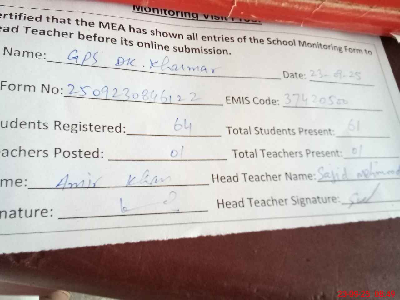 | Attendance Register | Head Teacher | MEA with School | Visit Proof |