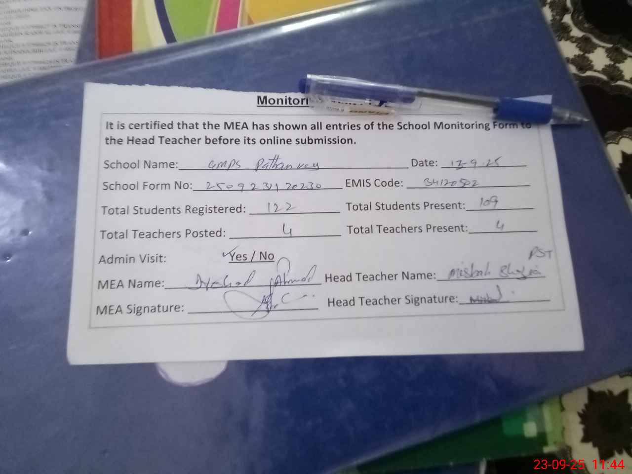 | Attendance Register | Head Teacher | MEA with School | Visit Proof |