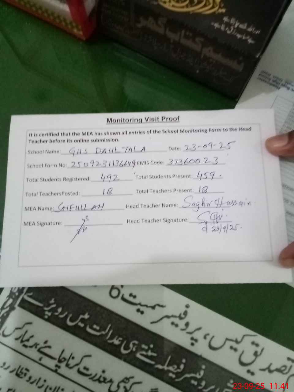 | Attendance Register | Head Teacher | MEA with School | Visit Proof |