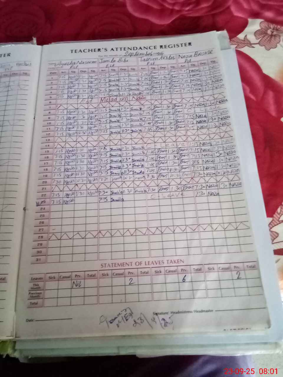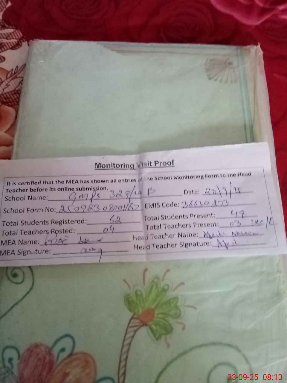 | Attendance Register | Head Teacher | MEA with School | Visit Proof |