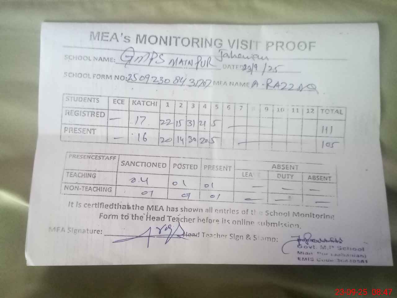 | Attendance Register | Head Teacher | MEA with School | Visit Proof |