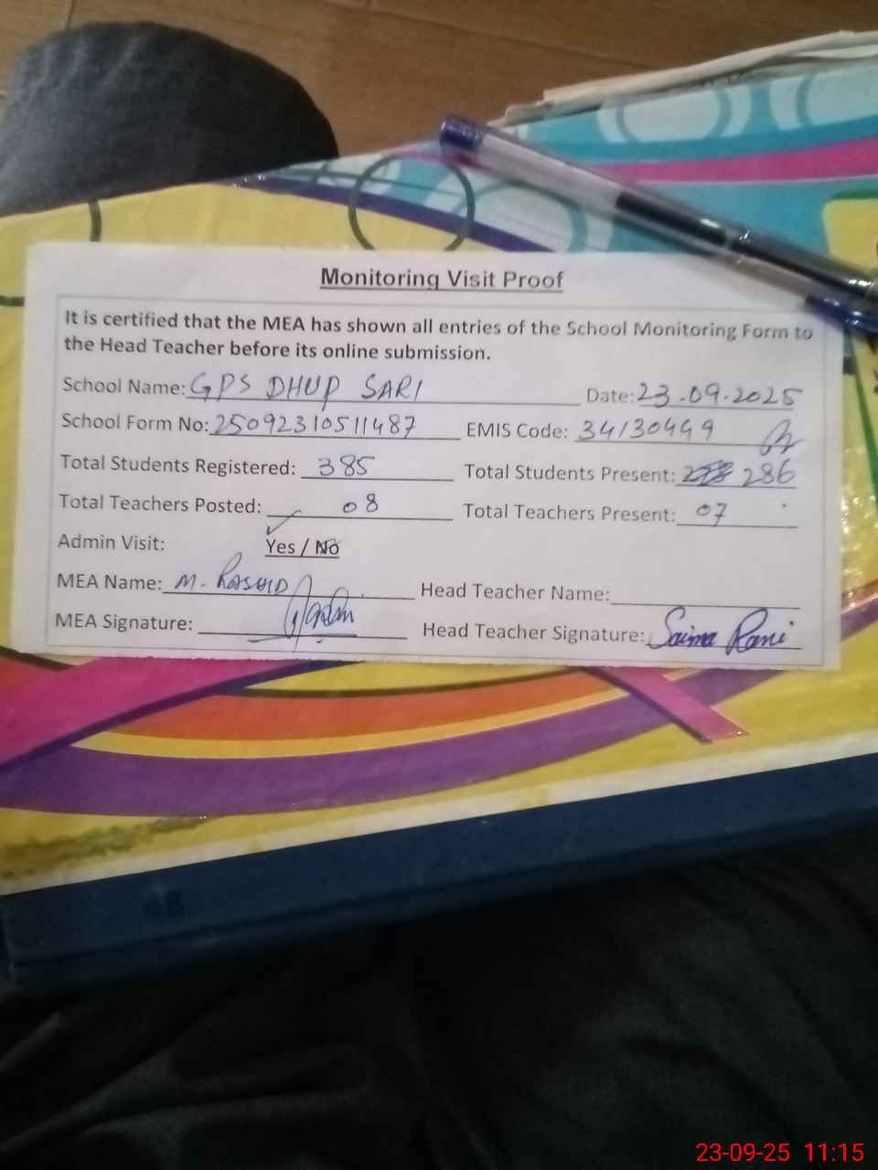 | Attendance Register | Head Teacher | MEA with School | Visit Proof |