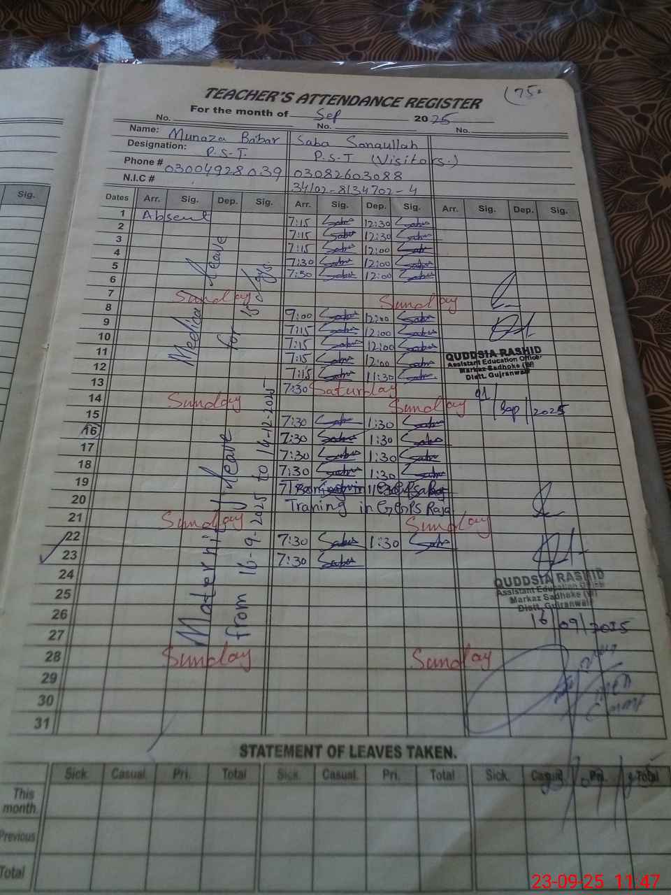 | CNIC | Full Name | Designation | R/C | Absence During Last Calender Month |