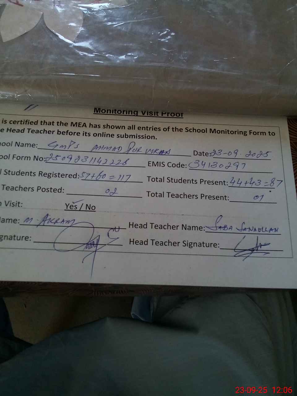 | Attendance Register | Head Teacher | MEA with School | Visit Proof |