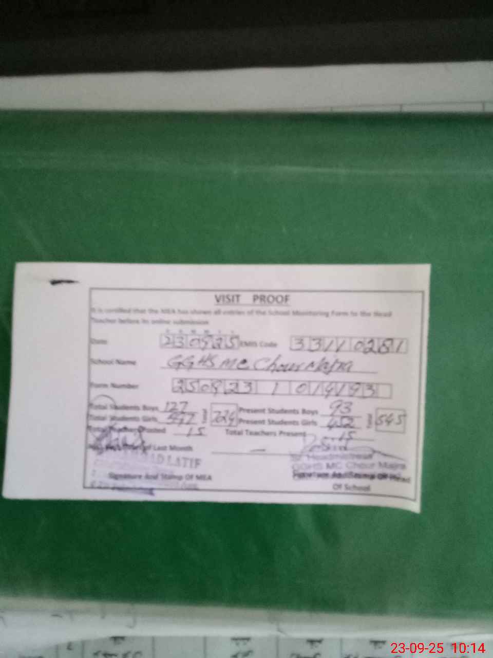 | Attendance Register | Head Teacher | MEA with School | Visit Proof |