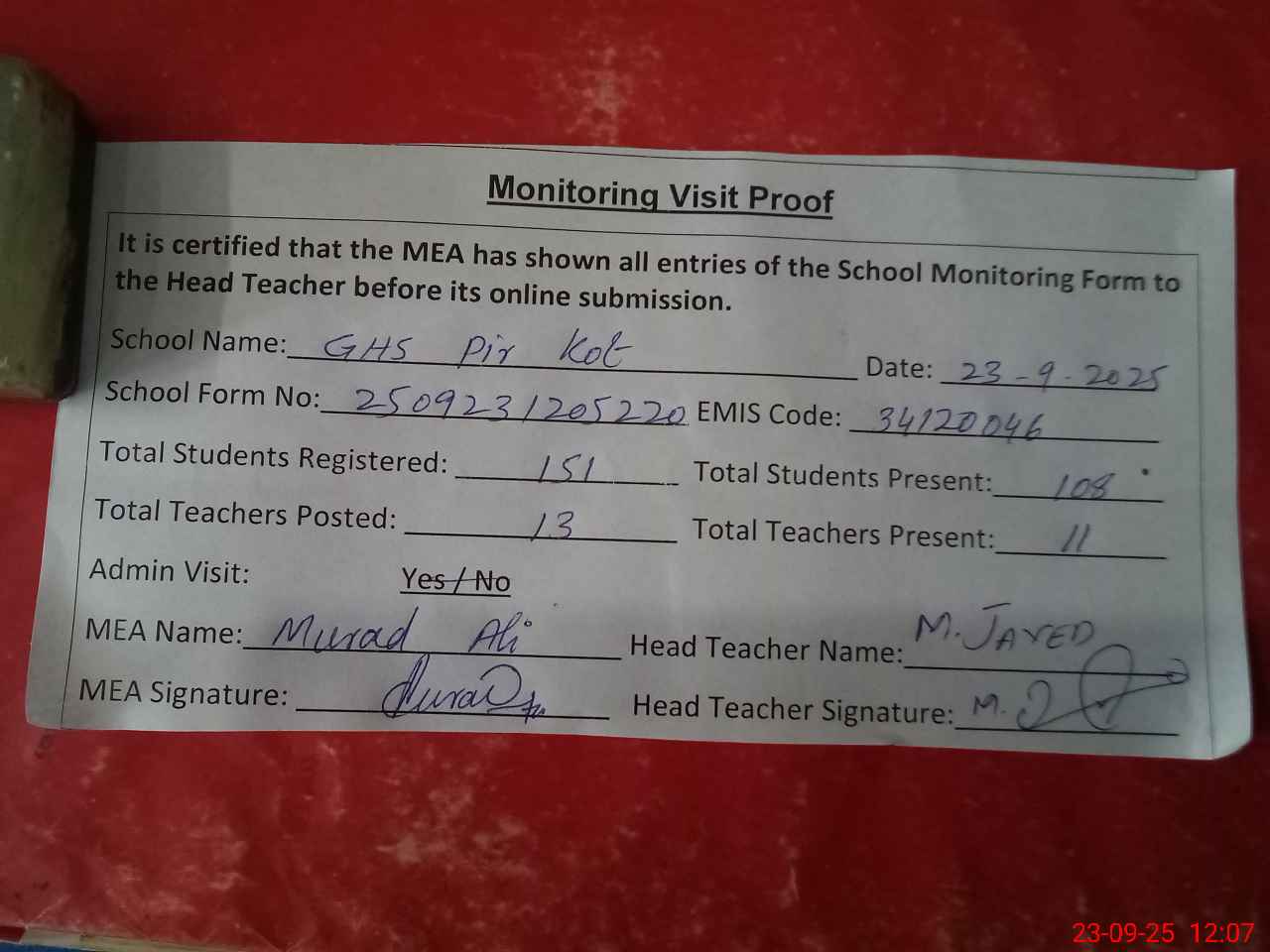 | Attendance Register | Head Teacher | MEA with School | Visit Proof |