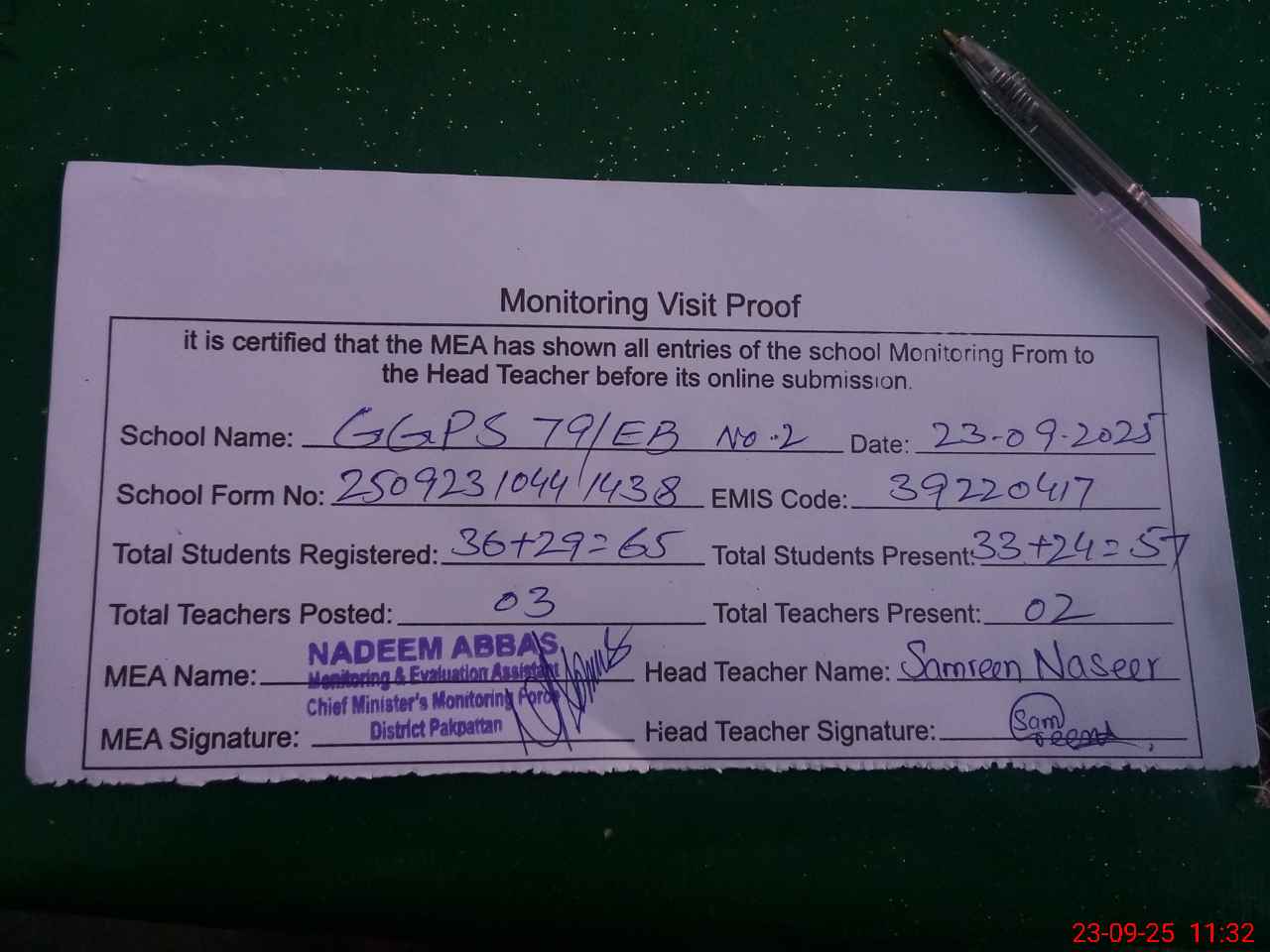 | Attendance Register | Head Teacher | MEA with School | Visit Proof |