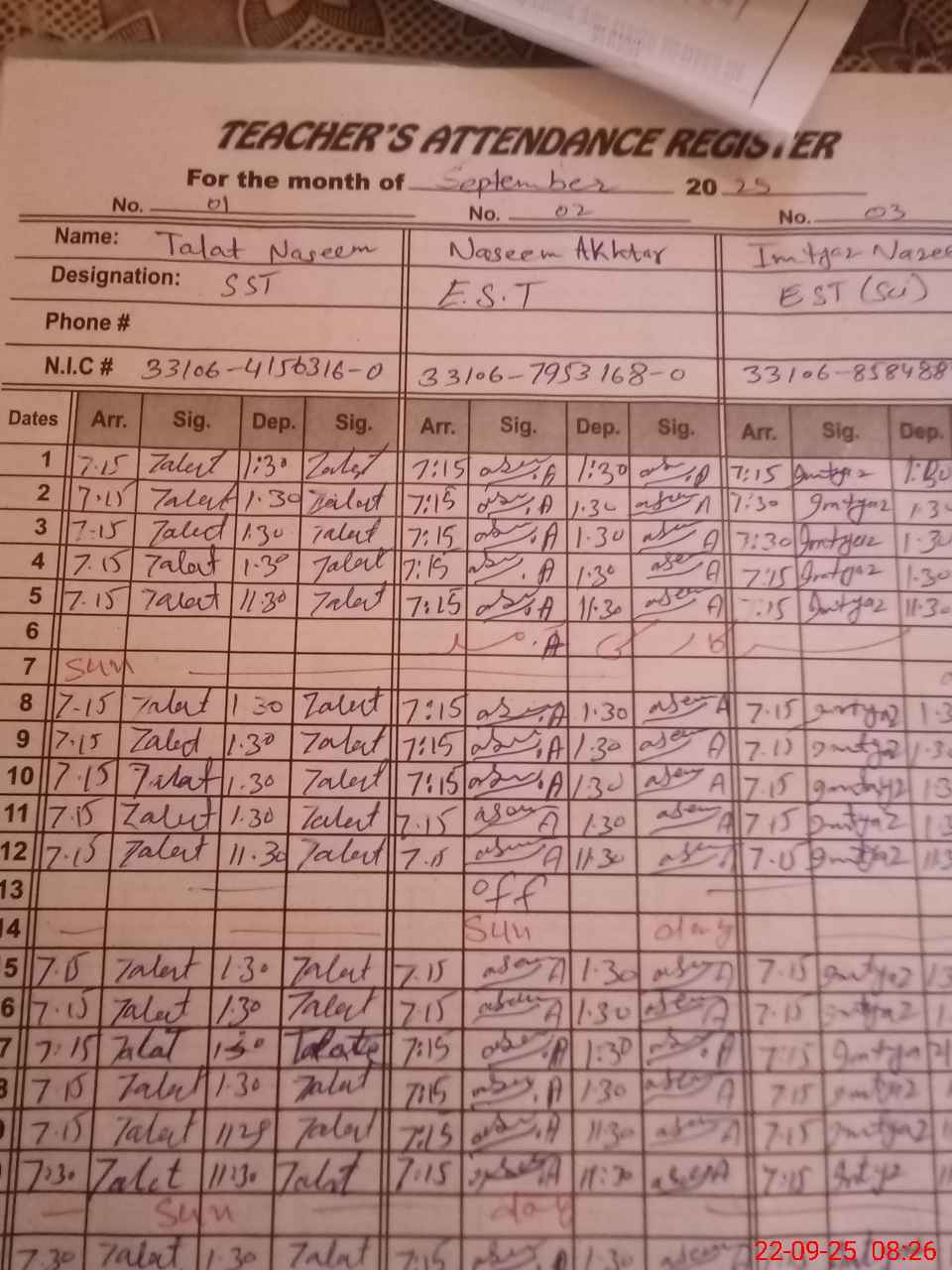 | CNIC | Full Name | Designation | R/C | Absence during last cal. month |