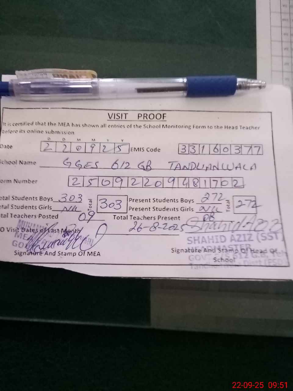 | Attendance Register | Head Teacher | MEA with School | Visit Proof |