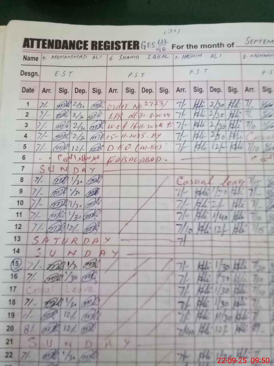 | CNIC | Full Name | Designation | R/C | Absence during last cal. month |