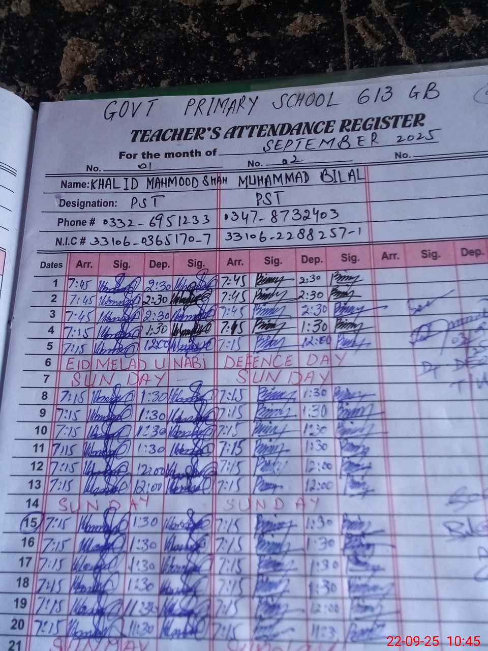 | Name: KH**** MA**** SH**** Designation: (School Headmaster's/Headmistress's) PST Phone/Cell Number: 03**** |