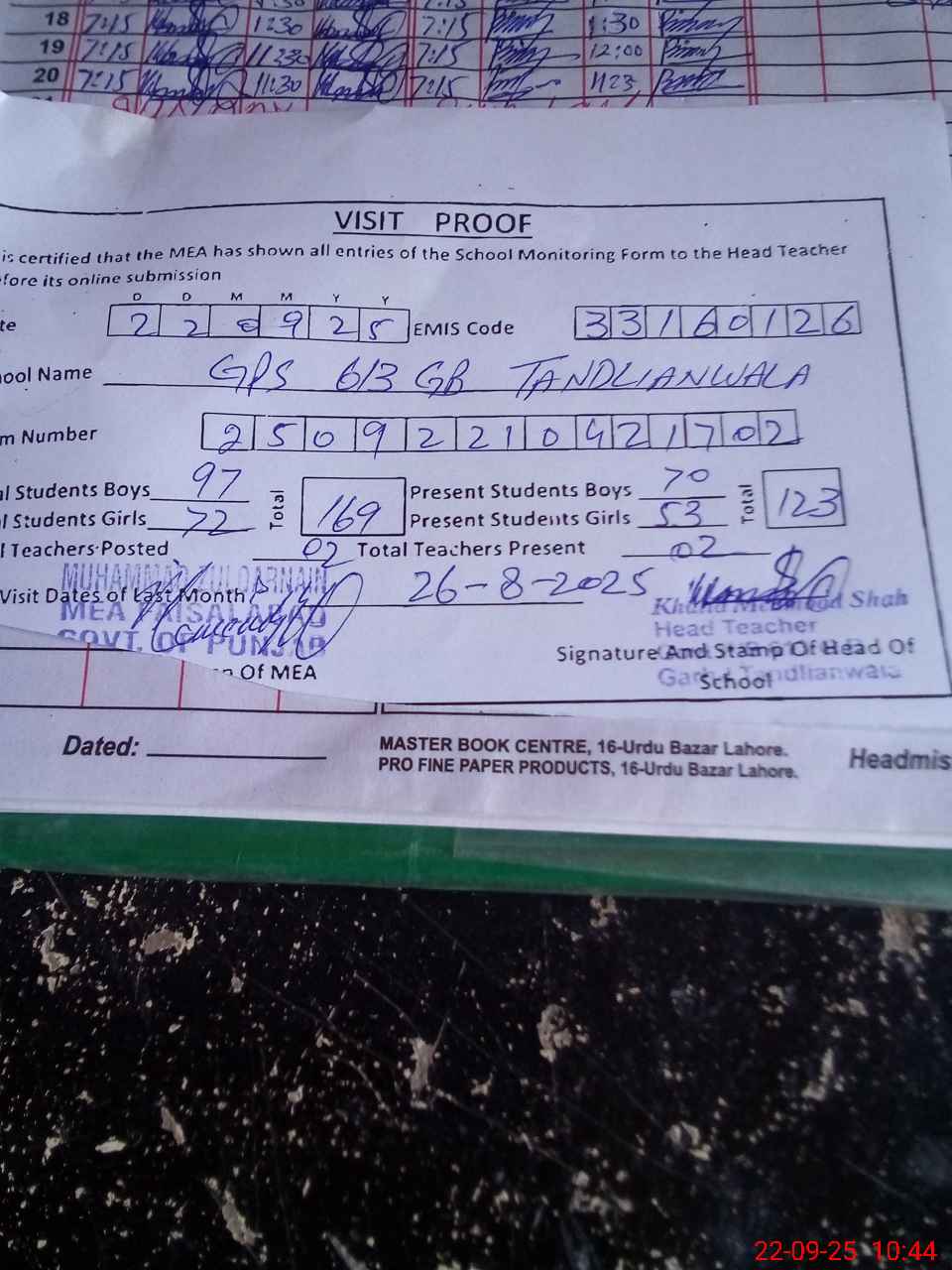 | Attendance Register | Head Teacher | MEA with School | Visit Proof |