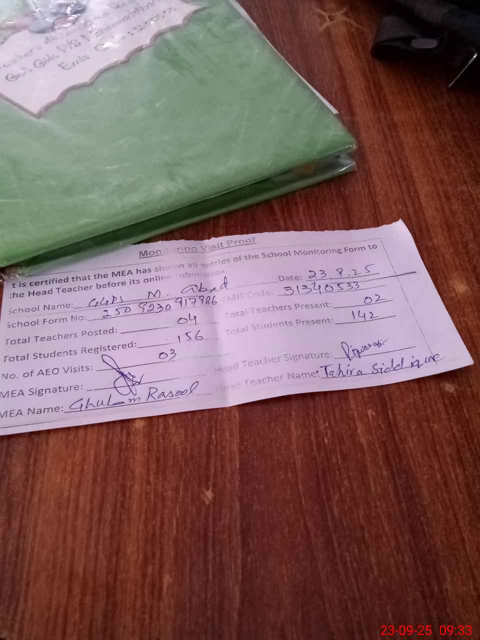 | Attendance Register | Head Teacher | MEA with School | Visit Proof |