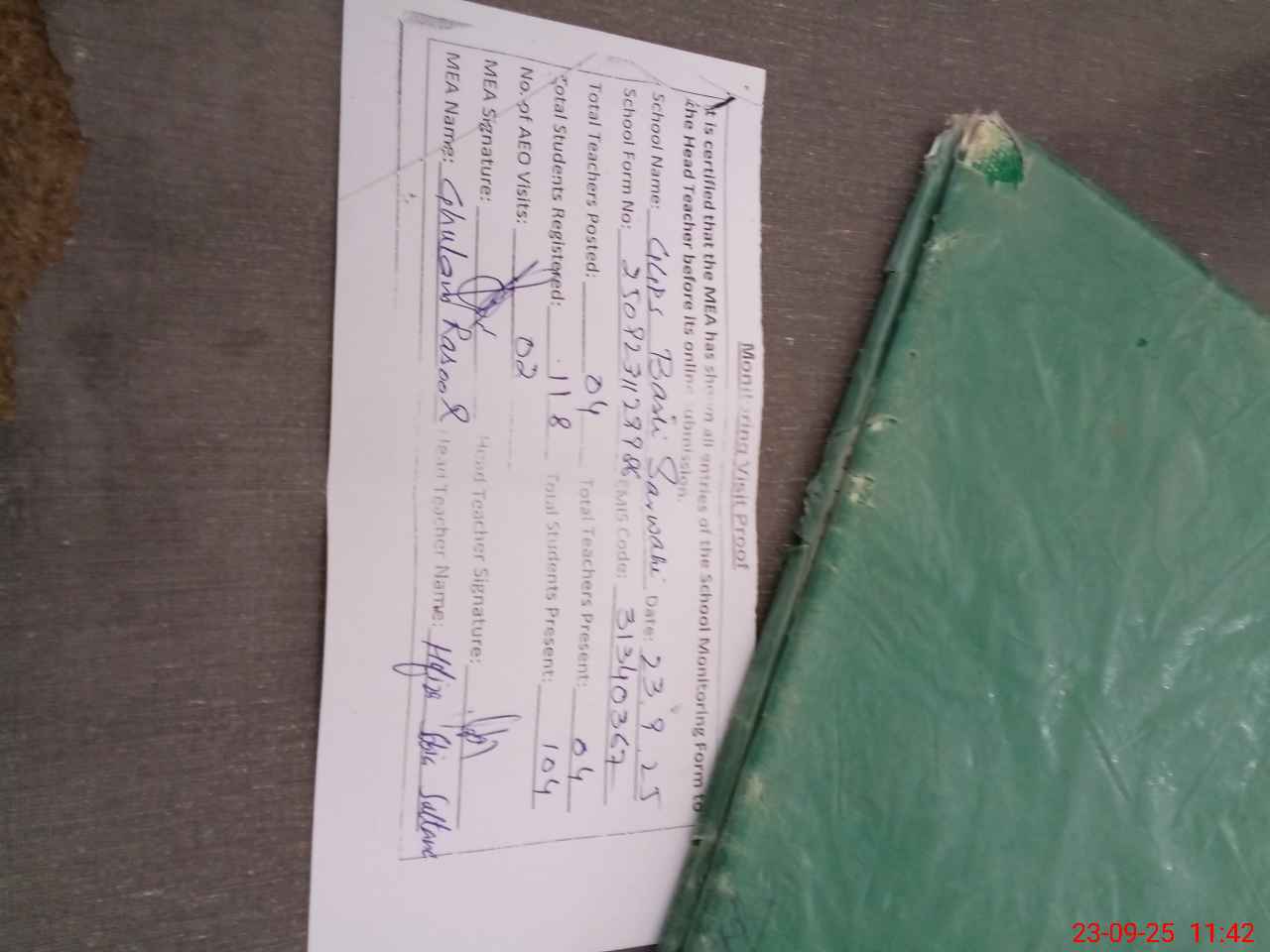 | Attendance Register | Head Teacher | MEA with School | Visit Proof |