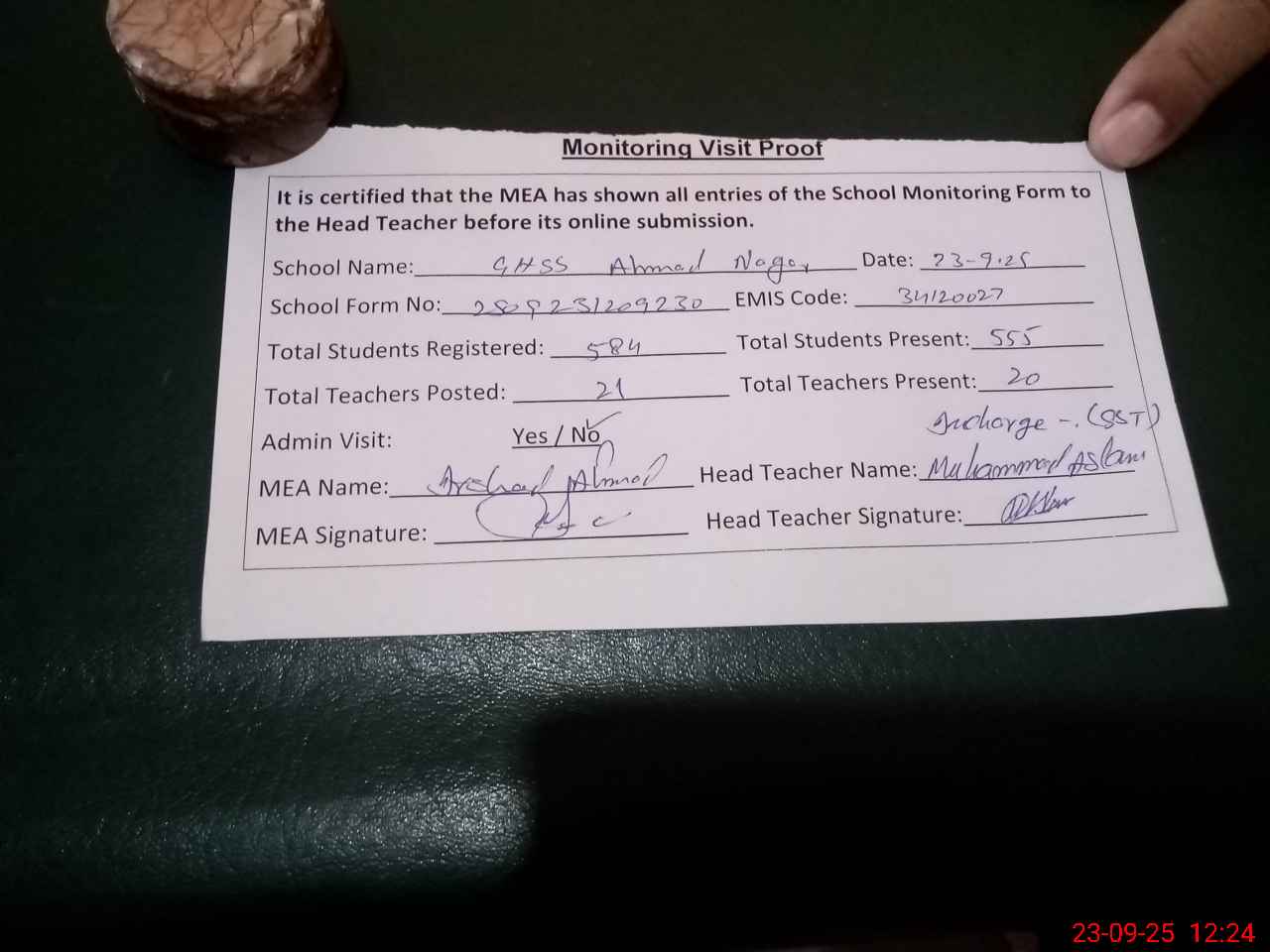 | Attendance Register | Head Teacher | MEA with School | Visit Proof |
