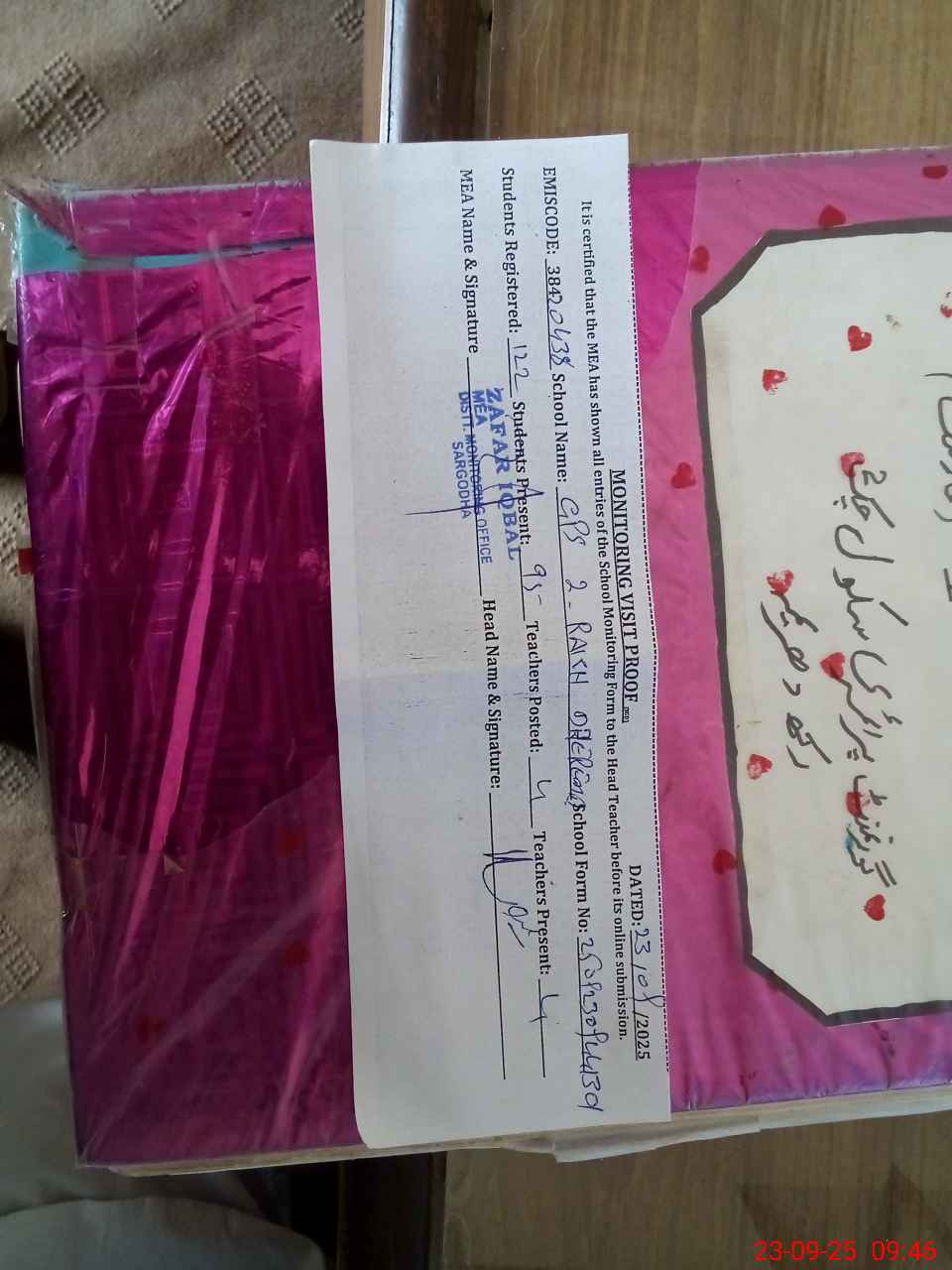 | Attendance Register | Head Teacher | MEA with School | Visit Proof |