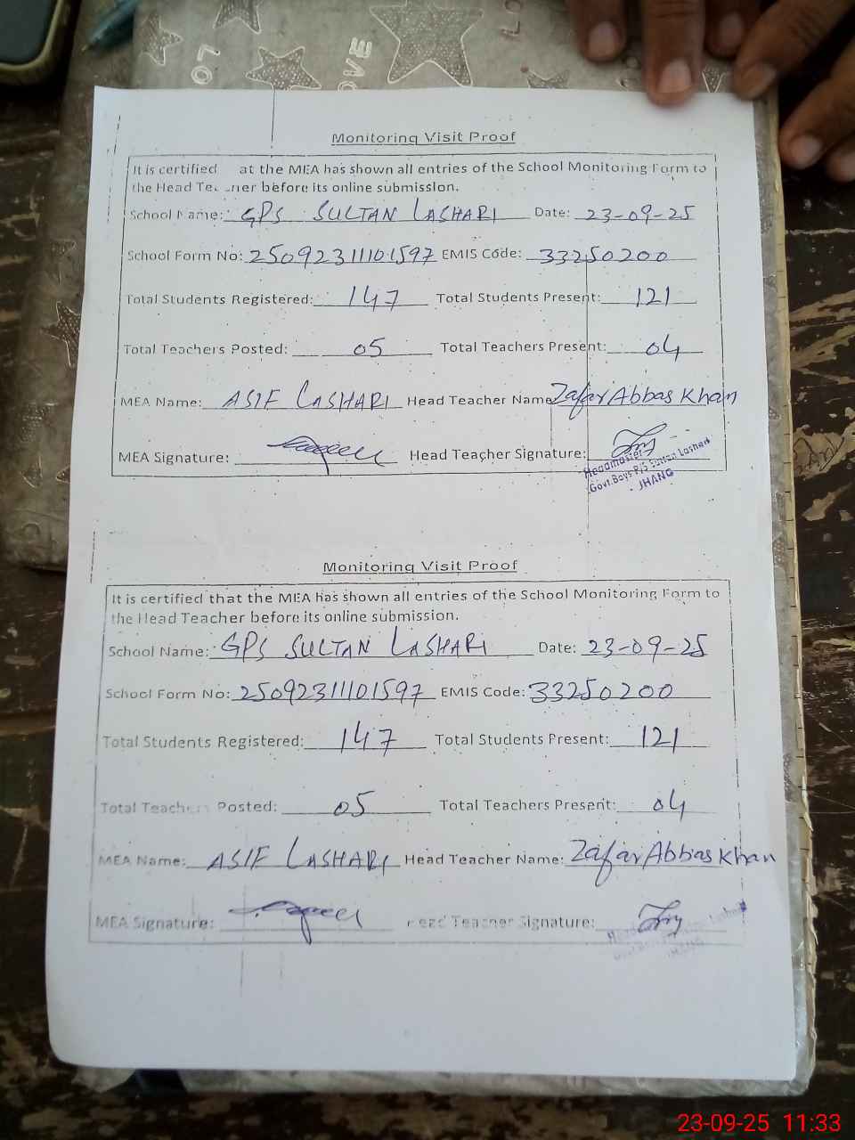 | Attendance Register | Head Teacher | MEA with School | Visit Proof |